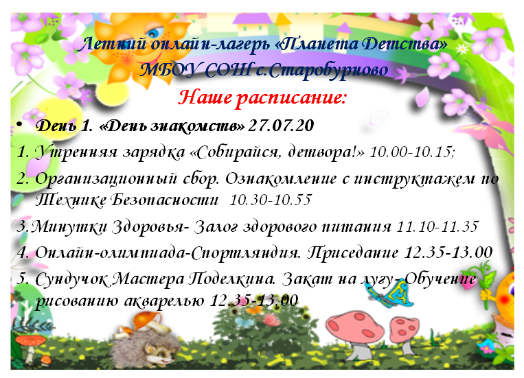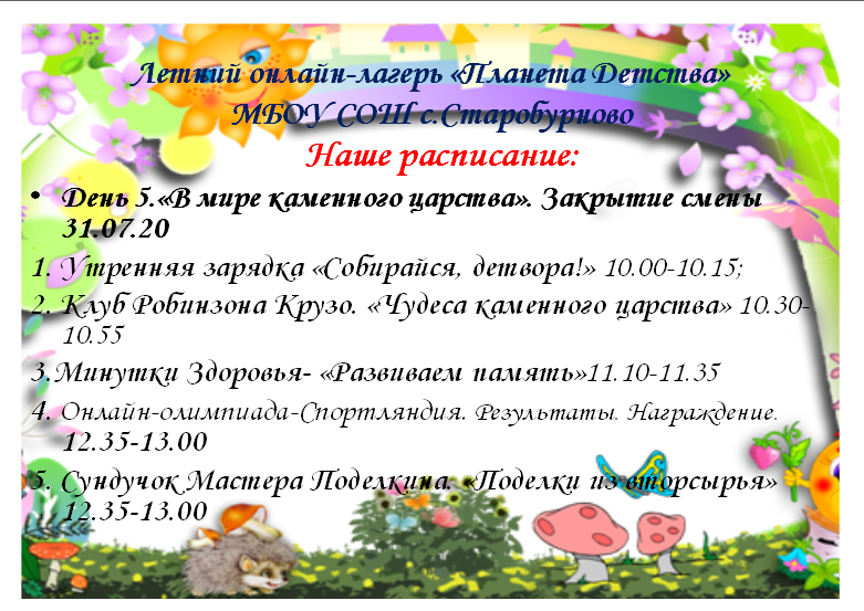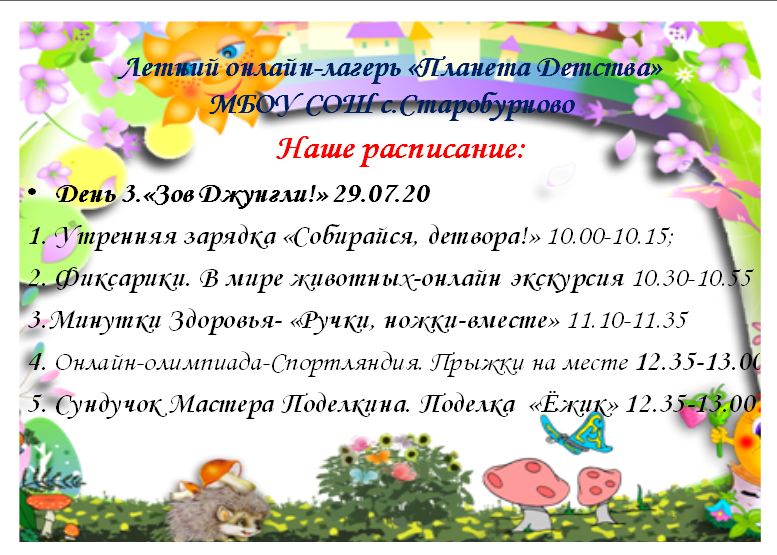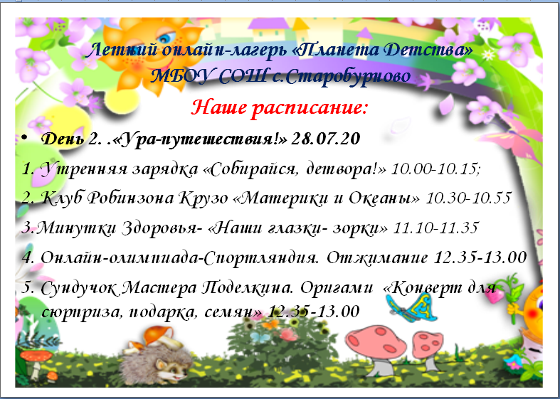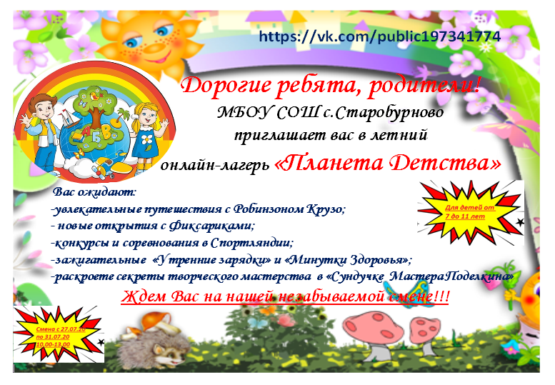 В МБОУ СОШ с. Старобурново 27 июля состоится открытие онлайн-лагеря "Планета детства". В течении пяти дней лагере детей ждут интересные конкурсы, физкультминутки, мастерские поделок. Эти пять увлекательных дней пройдут для детей занимательно и с пользой. Ждем вас с 27 июля по адресу: https://vk.com/public197341774