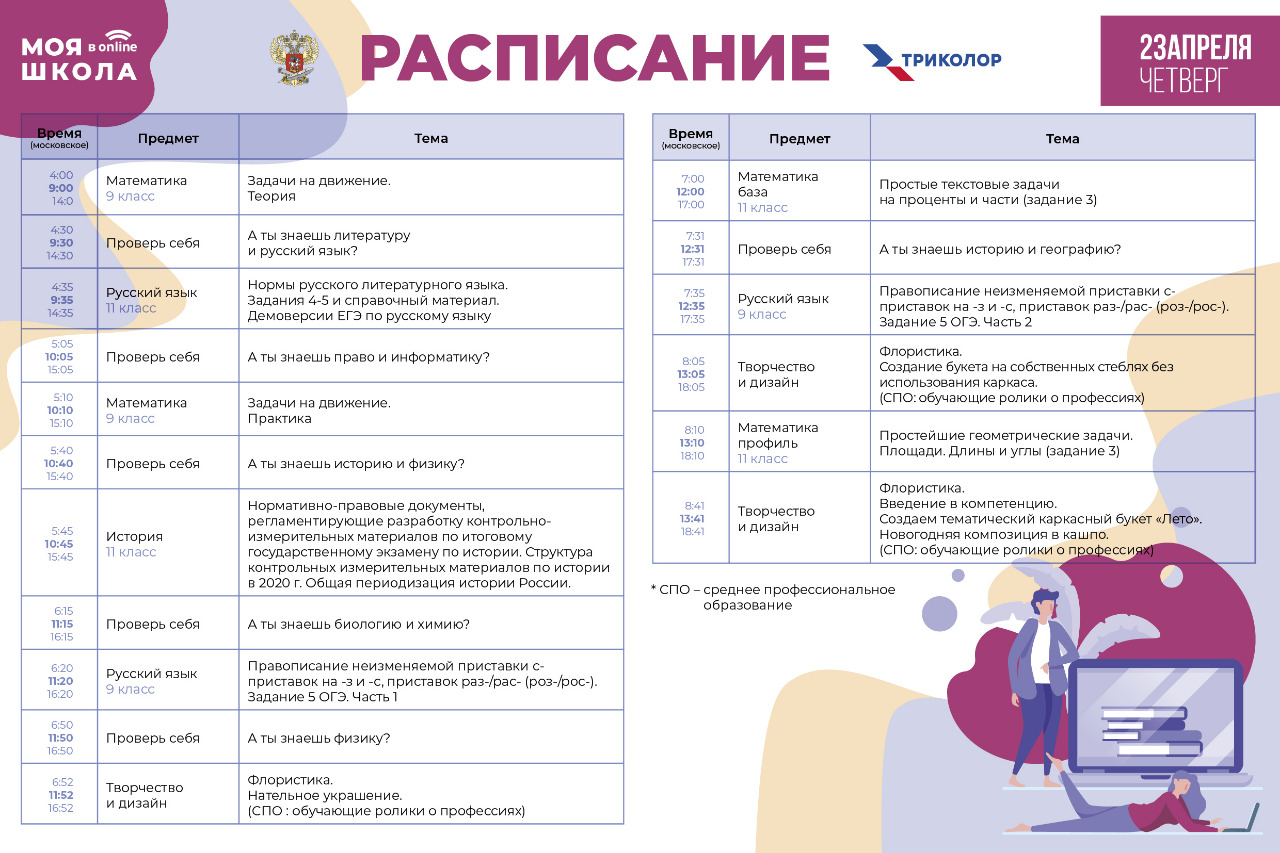 Расписание трансляций будет публиковаться в специальном разделе на сайте Министерства просвещения, в социальных сетях и на портале «Российская электронная школа». Вещание образовательного телеканала «МОЯ ШКОЛА в online» мультиплатформенного оператора цифровой среды «Триколор» продлится до конца учебного года.