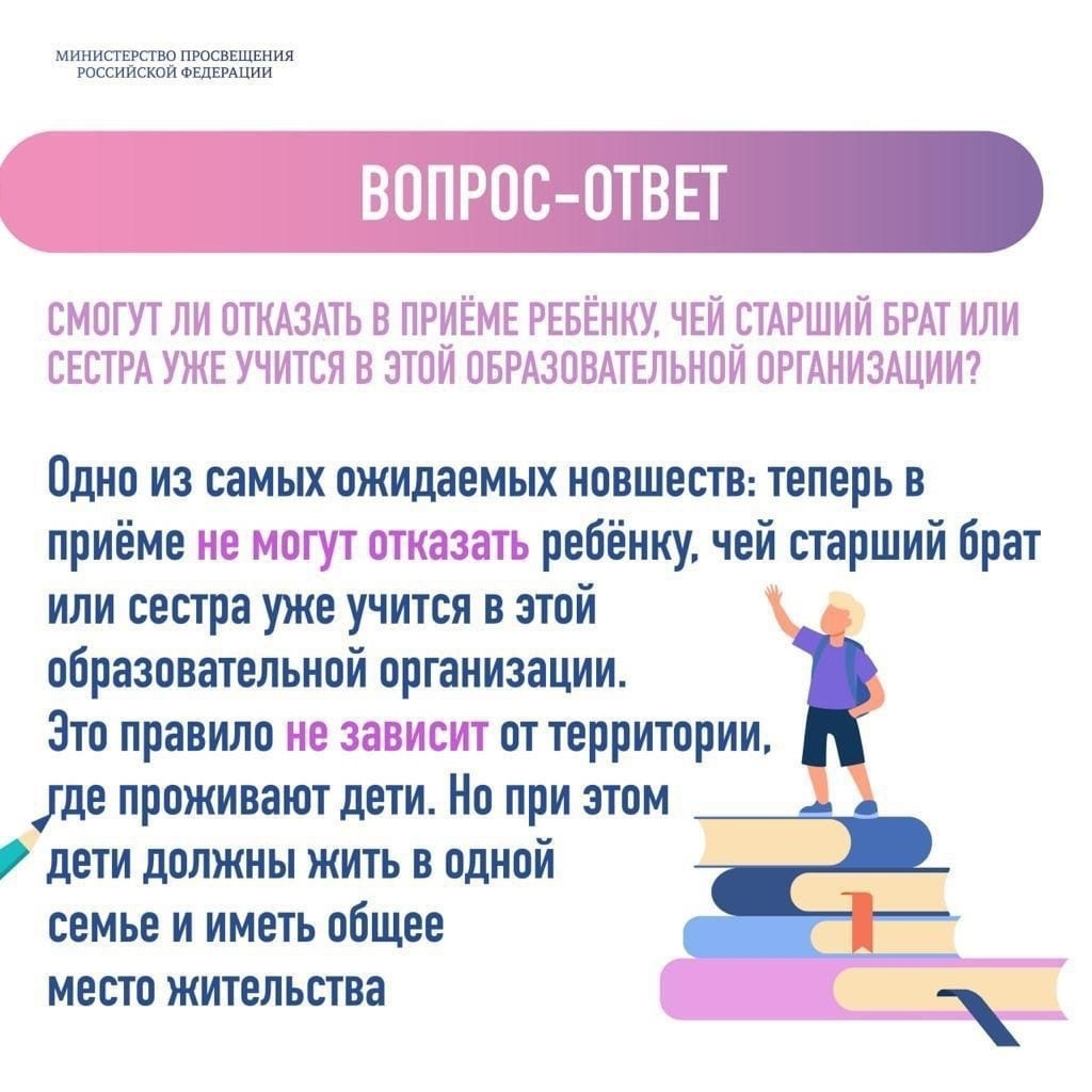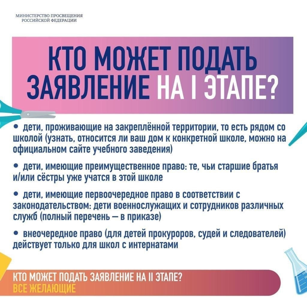 1 апреля началась запись детей в первые классы. Чтобы облегчить этот процесс, сделать его максимально комфортным, справедливым и прозрачным, Минпросвещения России разработало новый порядок, который впервые будет воплощён в жизнь в этом году. С подробной информацией можно ознакомиться на официальном сайте Министерства просвещения Российской Федерации: